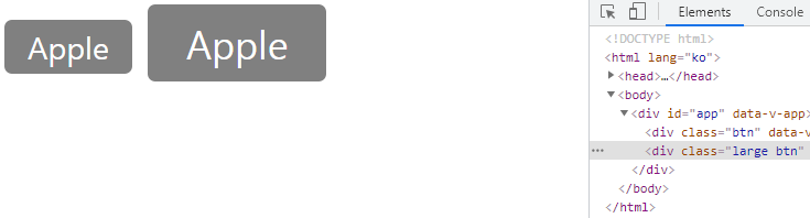<template> <div :class="{ large }" class="btn"> Apple </div> </template><script> export default { props: { large: { type: Boolean, default: false } } } </script><style scoped lang="scss"> .btn { display: inline-block; margin: 4px; padding: 6px 12px; border-radius: 4px; background-color: gray; color: white; cursor: pointer; &.large { font-size: 20px; padding: 10px 20px; } } </style>결과