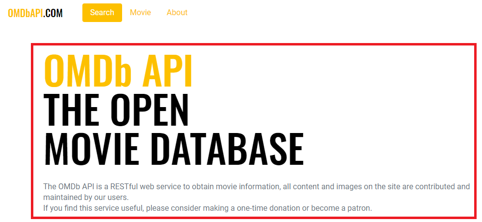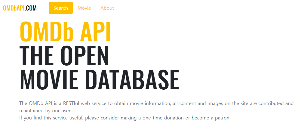 <template> <div class="container"> <h1> <span>OMDb API</span><br /> THE OPEN<br /> MOVIE DATABASE </h1> <p> The OMDb API is a RESTful web service to obtain movie information, all content and images on the site are contributed and maintained by our users.<br /> If you find this service useful, please consider making a one-time donation or become a patron. </p> </div> </template><style lang="scss" scoped> @import "~/scss/main"; .container { padding-top: 40px; } h1 { line-height: 1; font-family: "Oswald", sans-serif; font-size: 80px; span { color: $primary; } } p { margin: 30px 0; color: $gray-600; } </style>2. /src/routes/Home.vue 연결
