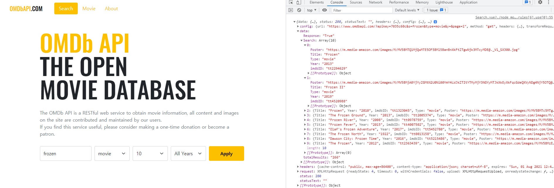 <script> import axios from 'axios' export default { data() { ... 생략 }, methods: { async apply() { // Search movies.. const OMDB_API_KEY = '7035c60c' const res = await axios.get(`https://www.omdbapi.com/?apikey=${OMDB_API_KEY}&s=${this.title}&type=${this.type}&y=${this.year}&page=1`) console.log(res) } } } </script>결과