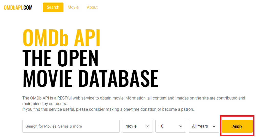 <!-- Search.vue --> <template> <div class="container"> <input ...생략 placeholder="Search for Movies, Series & more" @keyup.enter="apply" /> <div class="selects"> <select ...생략 </select> </div> <button class="btn btn-primary" @click="apply"> Apply </button> </div> </template><script> export default { data() { ... 생략 }, methods: { apply() { // Search movies.. } } }<style lang="scss" scoped> .container { ... 생략 .btn { width: 120px; height: 50px; font-weight: 700; flex-shrink: 0; } } </style>2. npm i axios 설치 (HTTP 비동기 통신 라이브러리)