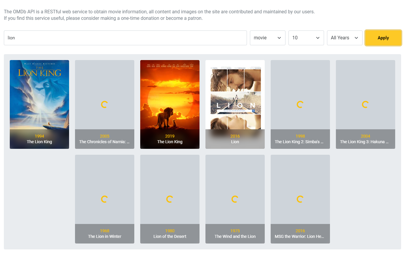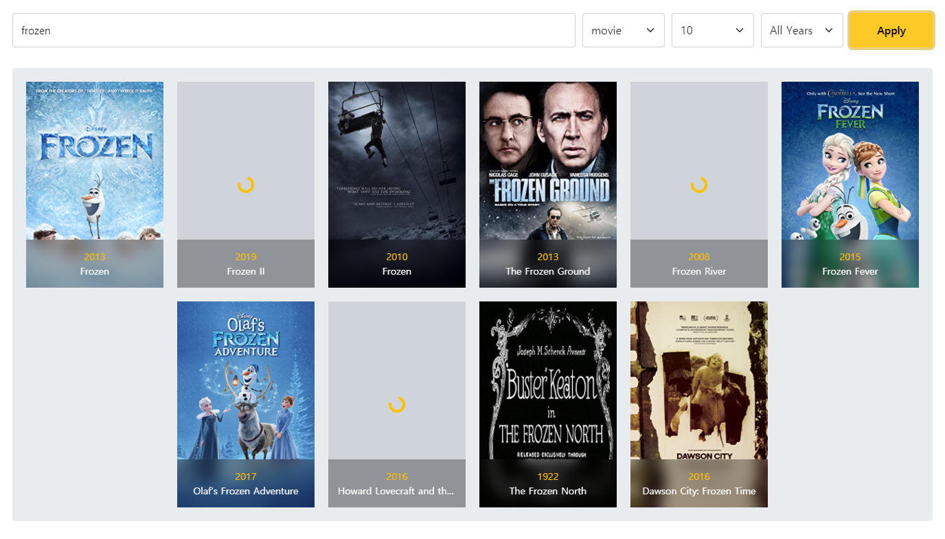 <template> <div :style="{ backgroundImage: `url(${movie.Poster})` }" class="movie"> <Loader v-if="imageLoading" :size="1.5" absolute /> ...<script> import Loader from '~/components/Loader' export default { components: { Loader }, props: { ... }, data() { return { imageLoading: true } }, mounted() { this.init() }, methods: { async init() { await this.$loadImage(this.movie.Poster) this.imageLoading = false } } } </script> ...4. /src/routes/Movie.vue 수정 (Movie 카테고리 포스터 이미지 로드 이벤트 추가)