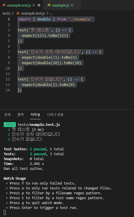 import { double } from './example' test('첫 테스트', () => { expect(123).toBe(123) }) test('인수가 숫자 데이터입니다', () => { expect(double(3)).toBe(6) expect(double(10)).toBe(20) }) test('인수가 없습니다', () => { expect(double()).toBe(0) })- /test/emapmle.js 생성