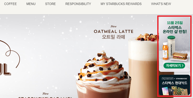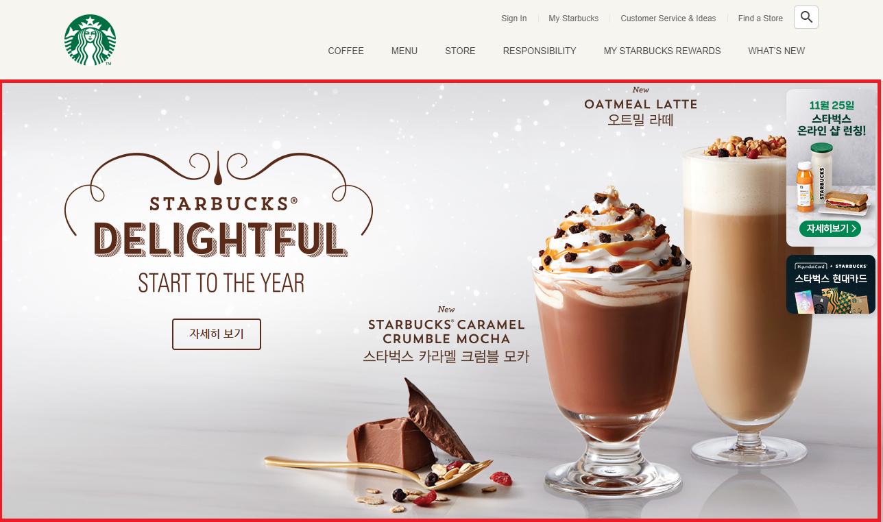 <!-- VISUAL --> <section class="visual"> <div class="inner"> <div class="title fade-in"> <img src="./images/visual_title.png" alt="STARBUCKS DELIGHTFUL START TO THE YEARS" /> <a href="javascript:void(0)" class="btn btn--brown">자세히 보기</a> </div> <div class="fade-in"> <img src="./images/visual_cup1.png" alt="new OATMEAL LATTE" class="cup1 image" /> <img src="./images/visual_cup1_text.png" alt="오트밀 라떼" class="cup1 text" /> </div> <div class="fade-in"> <img src="./images/visual_cup2.png" alt="new STARBUCKS CARAMEL CRUMBLE MOCHA" class="cup2 image" /> <img src="./images/visual_cup2_text.png" alt="스타벅스 카라멜 크럼블 모카" class="cup2 text" /> </div> <div class="fade-in"> <img src="./images/visual_spoon.png" alt="Spoon" class="spoon" /> </div> </div> </section>/* btn(버튼) 디자인 추가 */ .btn { width: 130px; padding: 10px; border: 2px solid #333; border-radius: 4px; color: #333; font-size: 16px; font-weight: 700; text-align: center; cursor: pointer; box-sizing: border-box; display: block; transition: .4s; } .btn:hover { background-color: #333; color: #FFF; } .btn.btn--reverse { background-color: #333; color: #FFF; } .btn.btn--reverse:hover { background-color: transparent; color: #333; } .btn.btn--brown { color: #582B18; border-color: #592B18; } .btn.btn--brown:hover { color: #FFF; background-color: #592B18; } /* VISUAL CSS */ .visual { margin-top: 120px; background-image: url("../images/visual_bg.jpg"); background-position: center; } .visual .inner { height: 646px; } .visual .title { position: absolute; top: 88px; left: -10px; } .visual .title .btn { position: absolute; top: 259px; right: 173px; } .visual .cup1.image { position: absolute; bottom: 0; right: -47px; } .visual .cup1.text { position: absolute; top: 38; right: 171px; } .visual .cup2.image { position: absolute; bottom: 0; right: 162px; } .visual .cup2.text { position: absolute; top: 321px; right: 416px; } .visual .spoon { position: absolute; bottom: 0; left: 275px; } .visual .fade-in { opacity: 0; }btn 디자인 추가 - 해당 예제의 "자세히 보기" 버튼 디자인