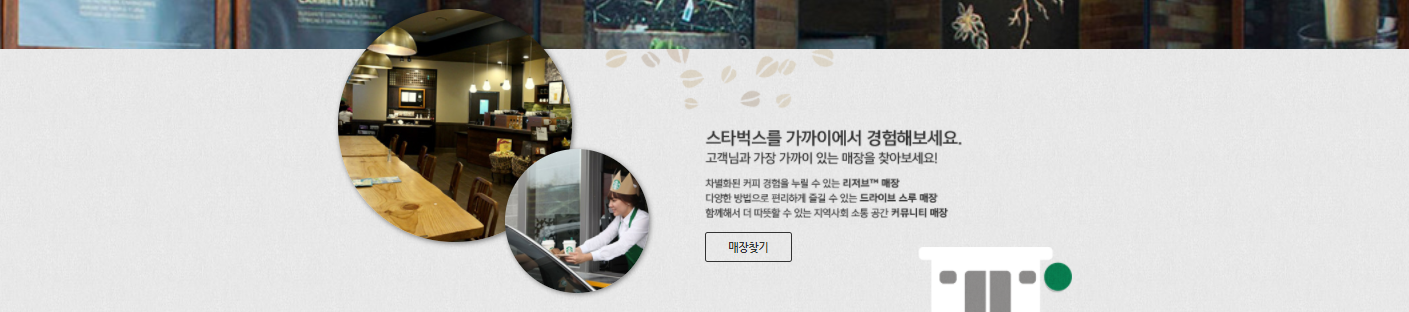 <!-- Find STORE --> <section class="find-store"> <div class="inner"> <img src="./images/find_store_texture1.png" alt="" class="texture1" /> <img src="./images/find_store_texture2.png" alt="" class="texture2" /> <img src="./images/find_store_picture1.jpg" alt="" class="picture picture1" /> <img src="./images/find_store_picture2.jpg" alt="" class="picture picture2" /> <div class="text-group"> <img src="./images/find_store_text1.png" alt="" class="title" /> <img src="./images/find_store_text2.png" alt="" class="description" /> <div class="more"> <a href="javascript:void(0)" class="btn">매장찾기</a> </div> </div> </div> </section>/* FIND STORE */ .find-store { background-image: url("../images/find_store_bg.jpg"); } .find-store .inner { height: 400px; } .find-store .texture1 { position: absolute; top: 0; left: 400px; } .find-store .texture2 { position: absolute; bottom: 0; right: 0; } .find-store .picture { border-radius: 50%; box-shadow: 2px 2px 8px rgba(0,0,0,.5); position: absolute; } .find-store .picture1 { top: -60px; left: 0; } .find-store .picture2 { top: 150px; left: 250px; } .find-store .text-group { position: absolute; top: 120px; left: 550px; } .find-store .text-group .title { margin-bottom: 20px; } .find-store .text-group .description { margin-bottom: 20px; }'프로젝트 > 스타벅스 클론코딩' 카테고리의 다른 글